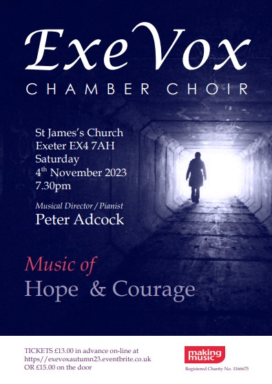 For this concert ExeVox’s eclectic array of music charts themes of hope, optimism, dreams and courage as explored by composers from Bruckner to Biebl; the enduring power of music (mostly unaccompanied); and the 150th anniversary of the birth of Rachmaninov. Exquisite choral cameos of beauty are by turns calming and inspired; nostalgic and noetic; ruminative and uplifting.